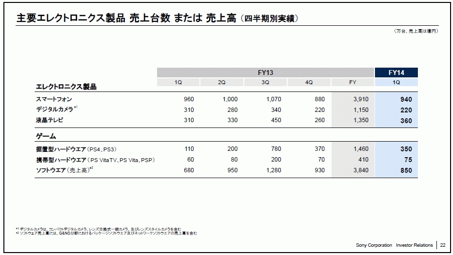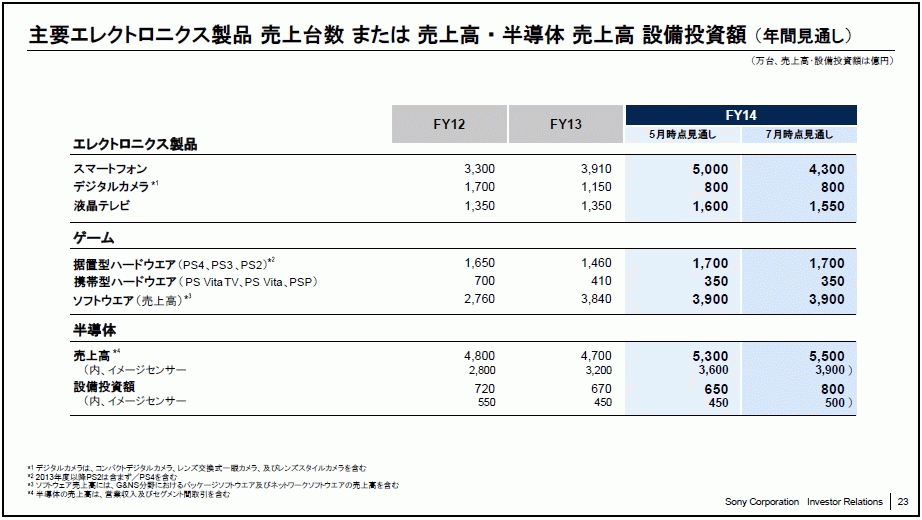 通期予想は変わっていないわけですが、日本でPS4をより売る(ソフトを誘致するなど)する他、世界ではPSVitaも売り出していけば予想を上回る程度の販売台数は出せるのではないかと思われます。