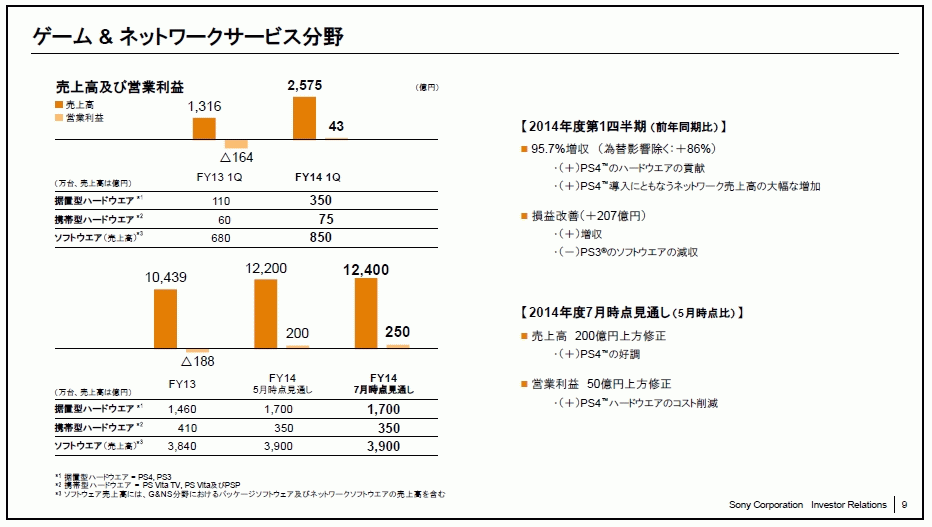 ゲーム&ネットワークサービス分野は前年同時期の売上高1316億円、営業損失164億円に対して売上高が2575億円、営業利益が43億円と大幅に増加。PS4の貢献とそれに伴うネットワークサービス収入が大幅に増加した為、としています。