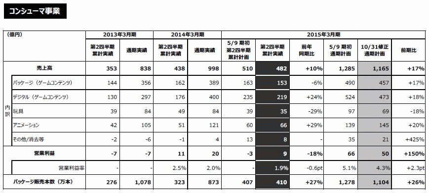 ゲームを含むコンシューマ事業は482.31億円を売り上げ営業利益は9.39億円、