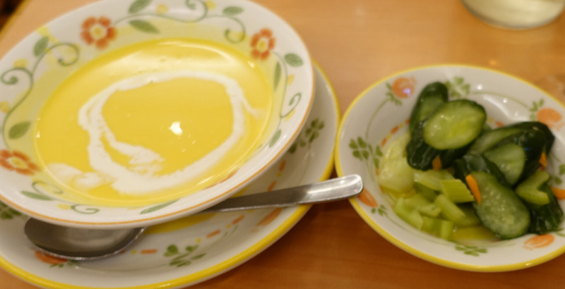この日はサイゼリヤにて冷たいパンプキンスープときゅうりのピクルス、
