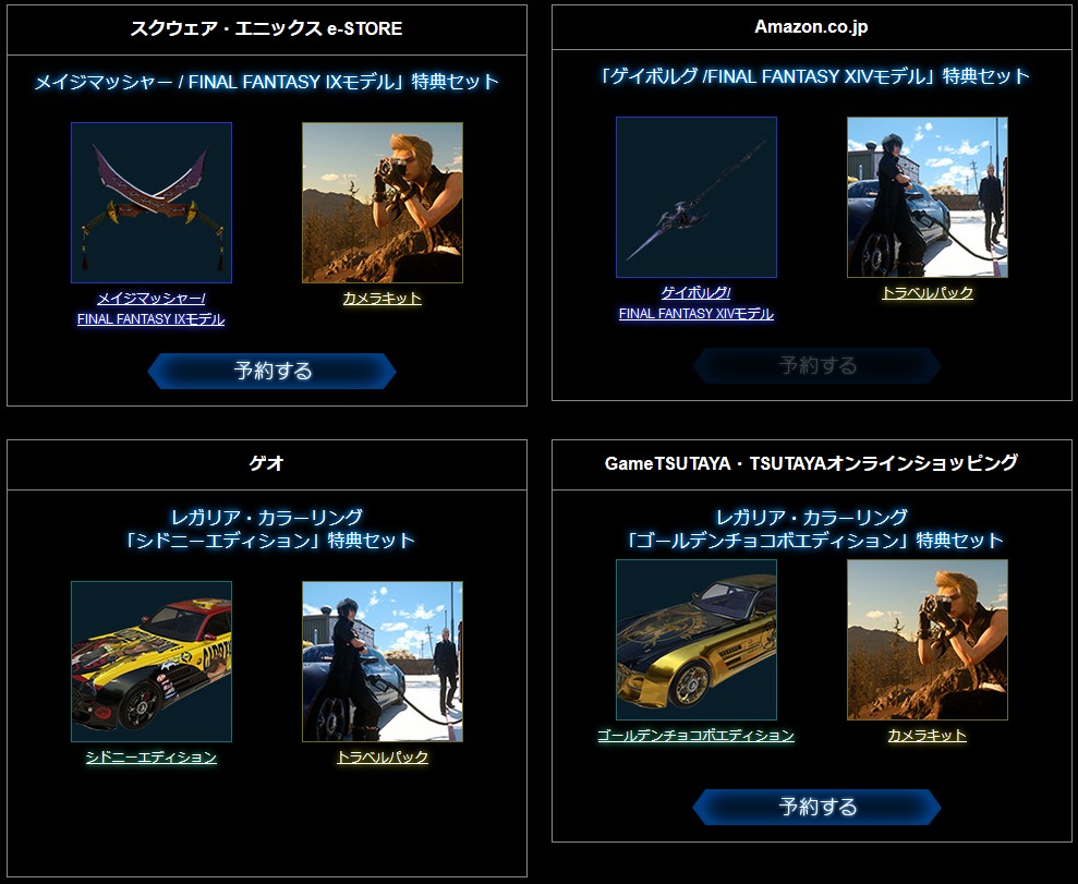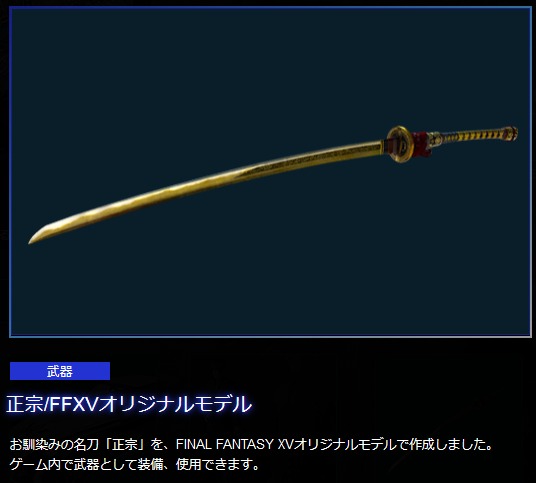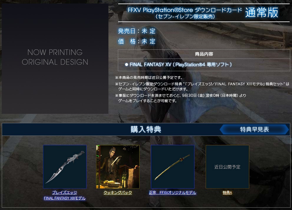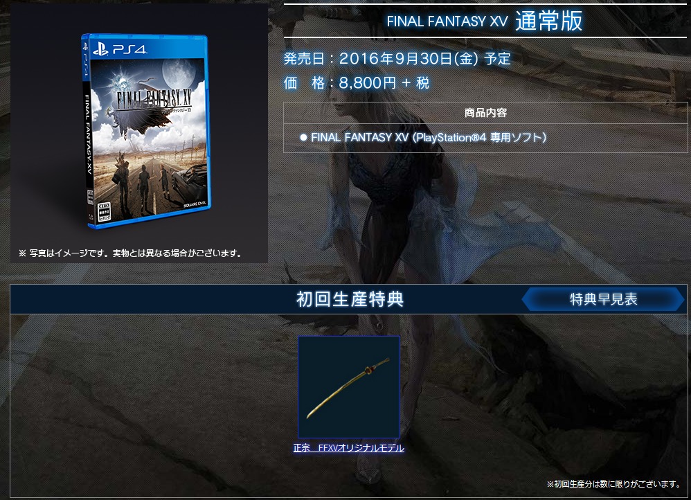 通常版は9504円、初回生産特典としてゲーム内武器「正宗 FFXVオリジナルモデル」が付属。