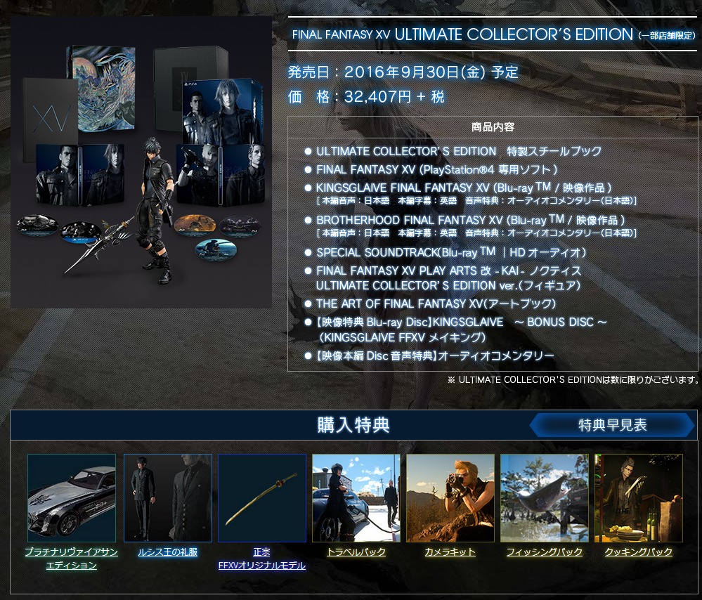 ウルティメイトコレクターズエディションはセブンネットとスクエニ公式ストア限定で34999円。ノクト王子のプレイアーツや、アニメの映像BD、アートブック、映像特典が追加。