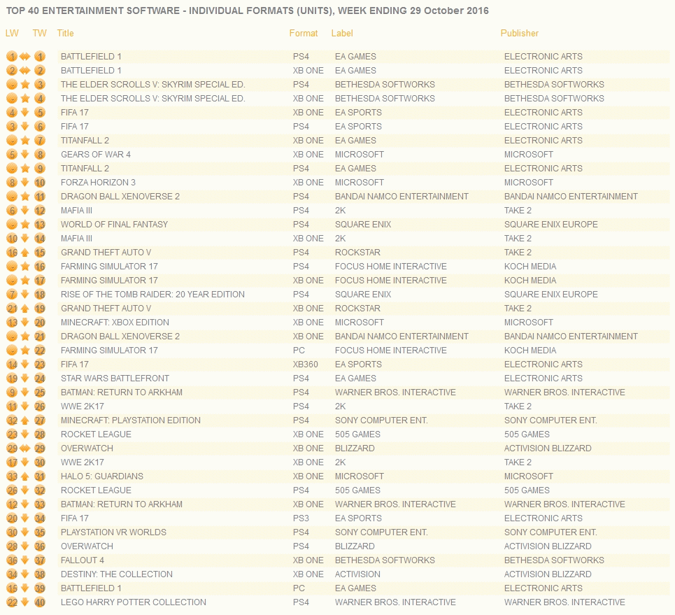 [GfK Chart-Track: TOP 40 ENTERTAINMENT SOFTWARE - INDIVIDUAL FORMATS (UNITS), WEEK ENDING 29 October 2016]