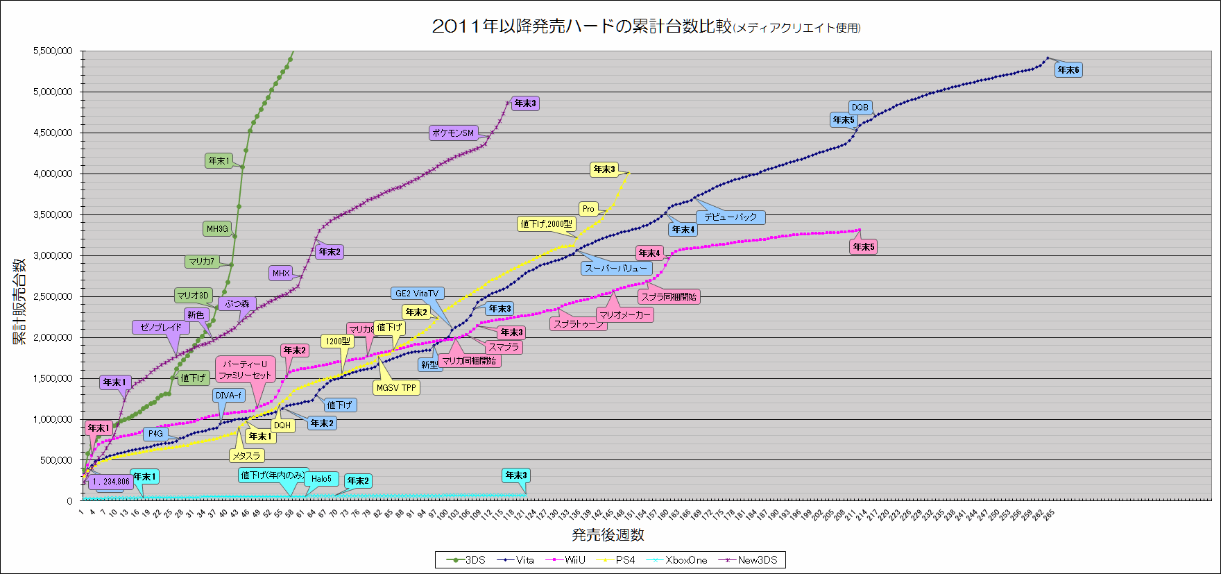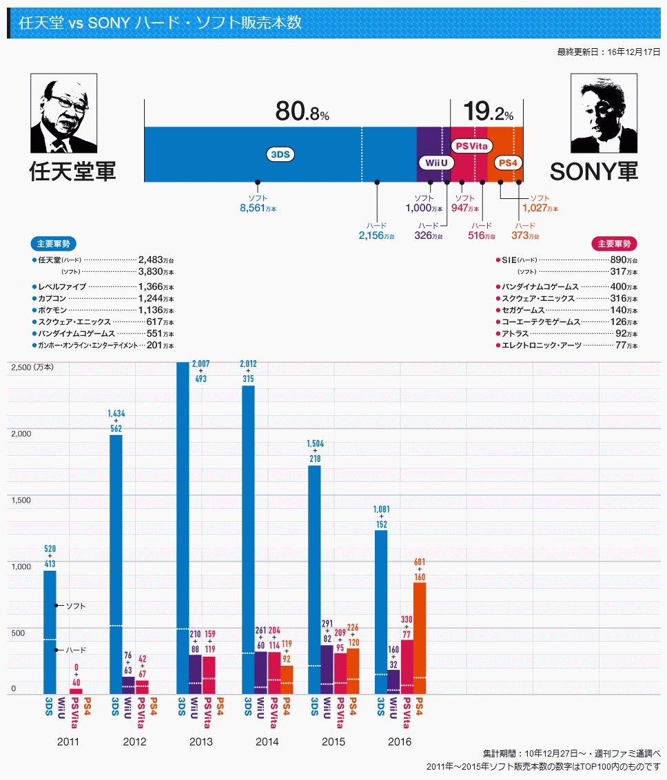 これ、前も何でハードとソフトの数字を足してるんだとか任天堂VSソニーと言っておいて売上高はガン無視かとか、PS3やPSPが現役だった時期からの話なのに無視しているのは如何な物かとか色々突っ込みはありましたね。