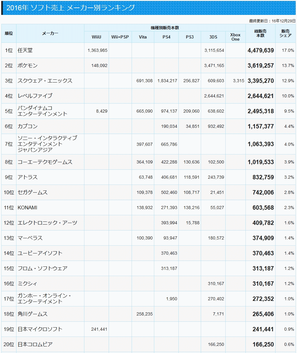 [ゲーム売上定点観測: 2016年 ソフト売上 メーカー別ランキング]