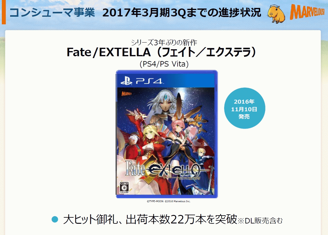 コンシューマ事業はFate/EXTELLAが22万本を突破。
