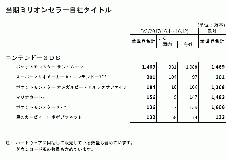 当第3四半期(平成28年4月~12月)の状況は、ニンテンドー3DSでは、全世界で発売した『ポケットモンスター