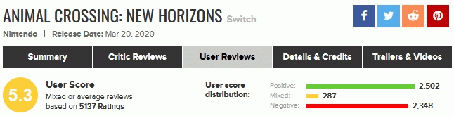 [metacritic: Read User Reviews and Submit your own for Animal Crossing: New Horizons on Switch]