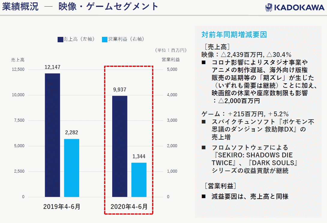 映像・ゲームでまとめられていますが映像事業が大幅減収減益となっており、ゲーム事業はやや増収しているぐらいだそうです。