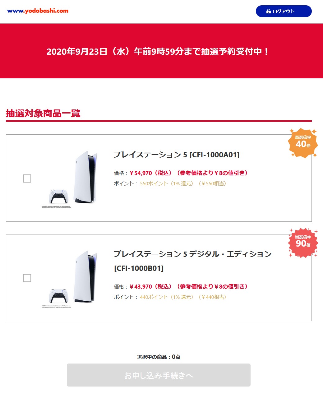 上記リンクはパーマリンクでは無いため、時間が過ぎて別の抽選が始まったら別の商品に切り替わるかもしれませんが、本日9:59まで受付中のPS5抽選販売の倍率が通常版40倍、デジタル版90倍にまで増加。