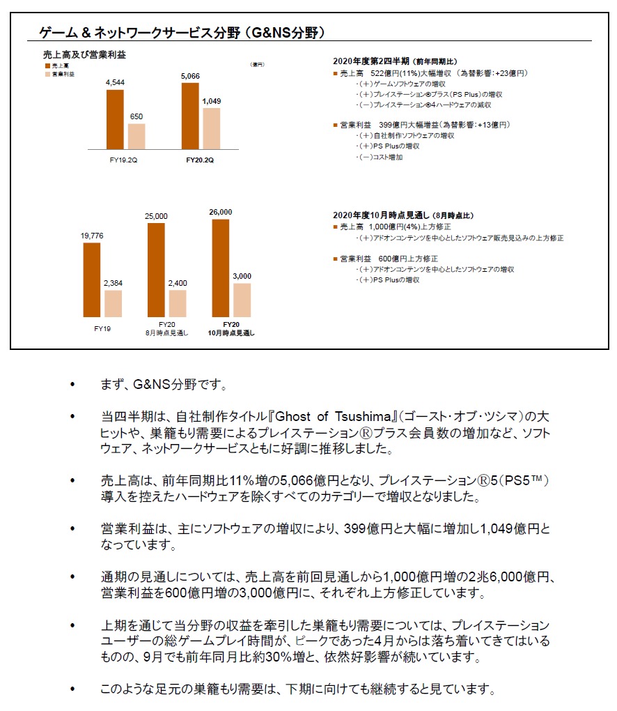 第2四半期は「Ghost of Tsushima」が大ヒット、またPS+の会員数も増加し好調に推移した、と。