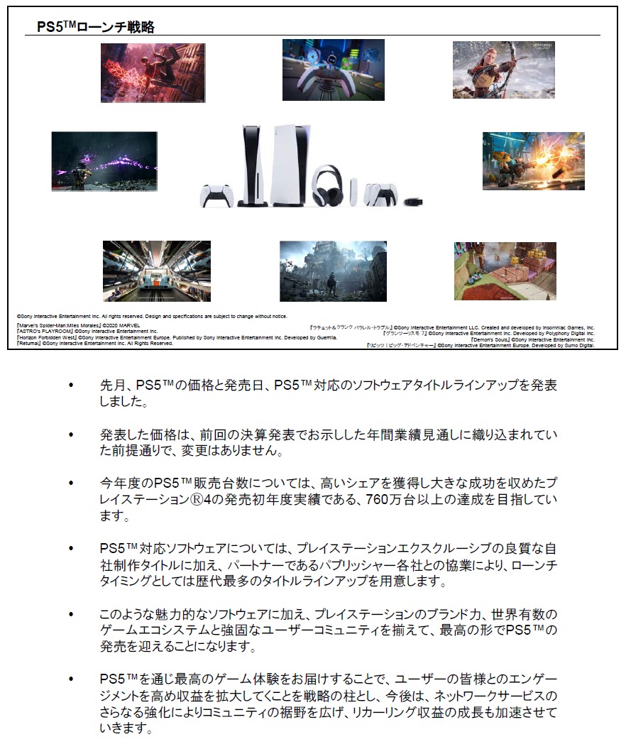 またPS5のロンチに向けては発売日と価格は予定されていた通りであり業績見通しへの影響は無し、PS4の初年度販売台数760万台を上回る販売台数を目指している、とも。