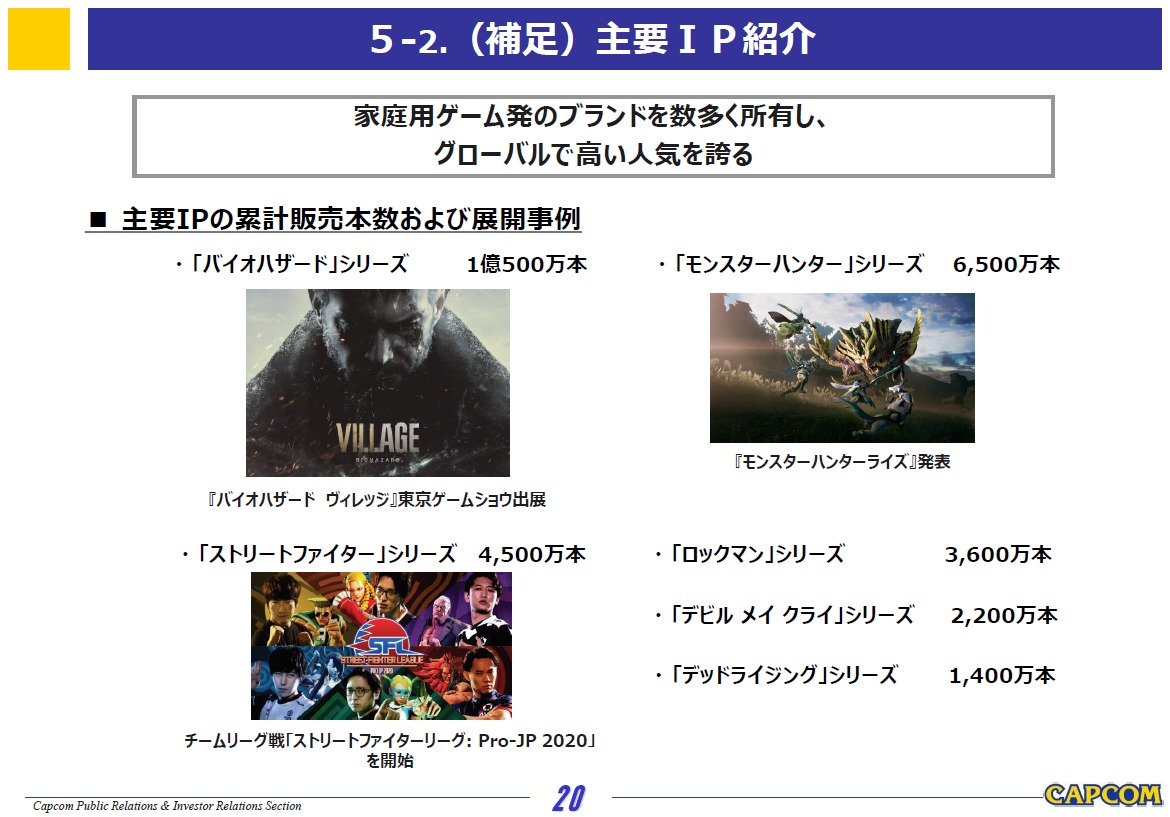 IP紹介によると「モンスターハンター」シリーズが累計6500万本となっている事から第1四半期末時点に比べ100万本を上積み。