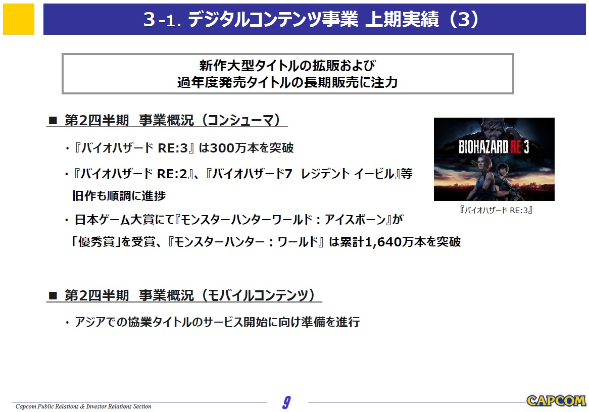 バイオRE:3は300万本、MHWは累計1640万本を突破、と前四半期末と比較しそれぞれ30万本伸ばしています。