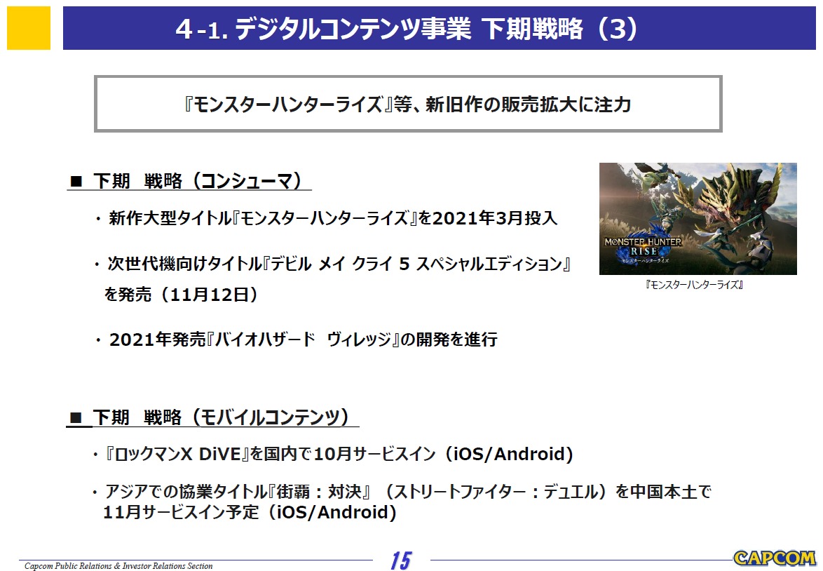 で下期については「モンスターハンターライズ」を年度末の3月に、次世代機のロンチに合わせて「デビルメイクライ5 スペシャルエディション」を発売する予定としていますが、業績の通期見通しは据え置き。