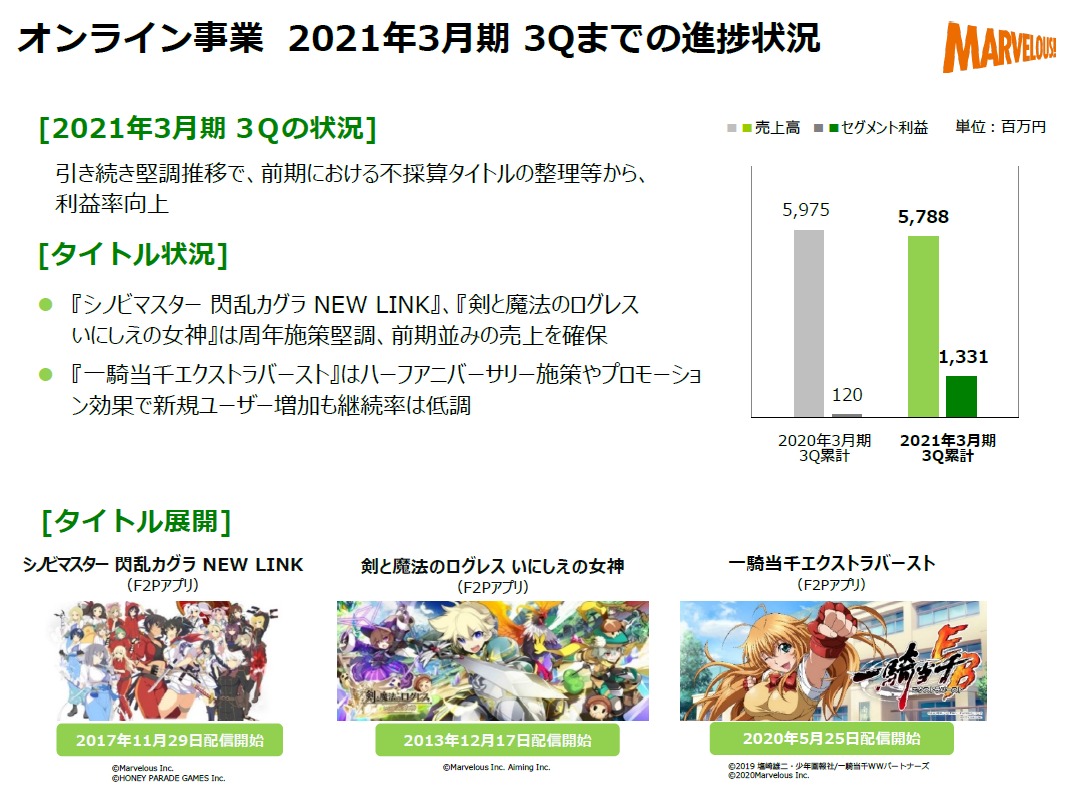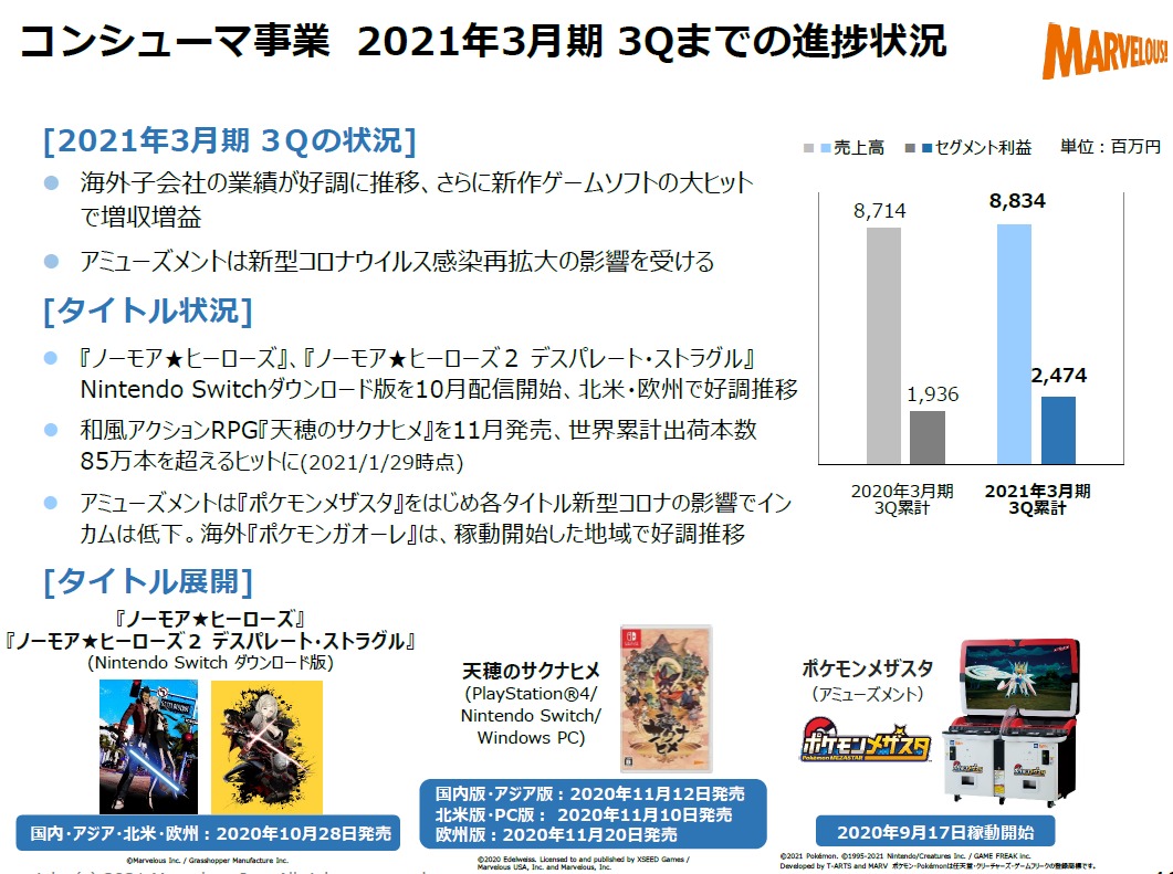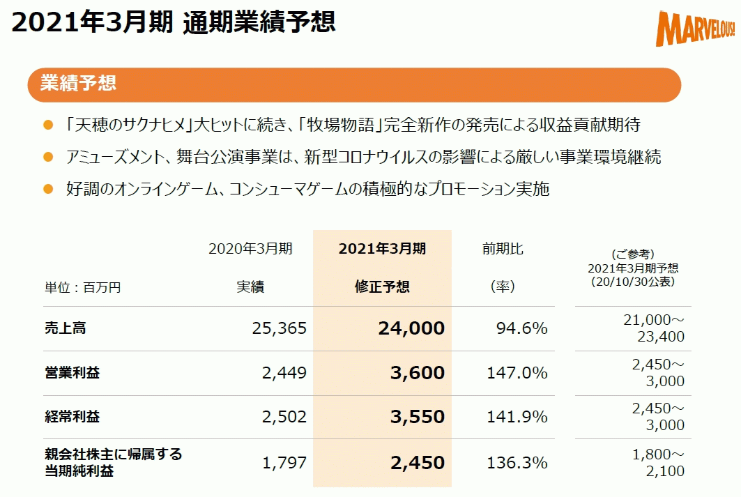 [マーベラス: 2021年3月期 第3四半期決算短信〔日本基準〕(連結) / 通期業績予想の修正および期末配当予想に関するお知らせ / 決算説明資料](pdf)