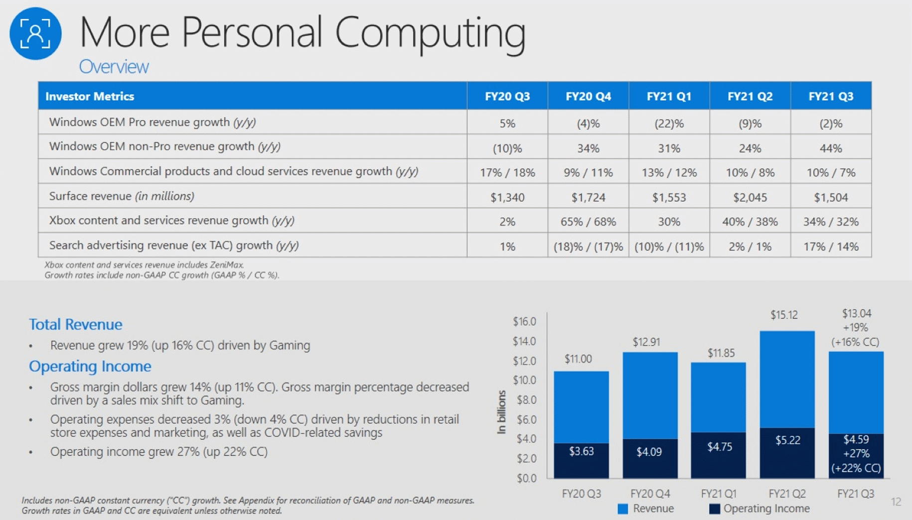 Windows OSのOEMが主力事業となっているMore Personal Computing分野は売上高130.4億ドル、営業利益45.9億ドルと利益率はかなりの物ですが3分野で最も稼げていない分野ですね。