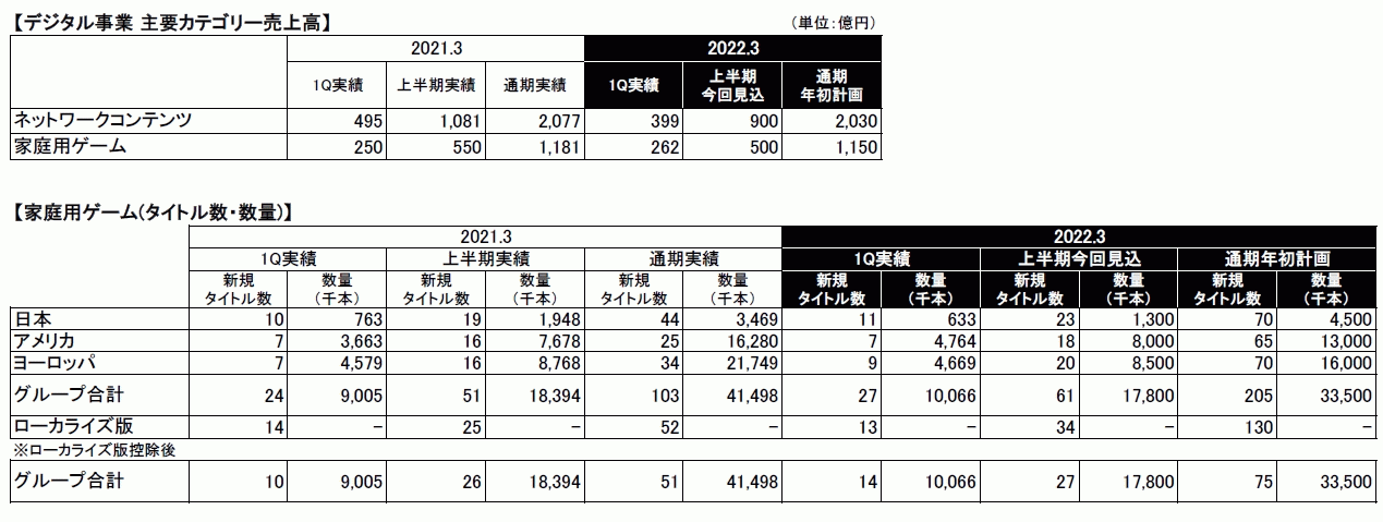 デジタル事業につきましては、家庭用ゲームにおいて、ゲームとアニメーションの連動展開をはかる新作タイトル「SCARLET NEXUS」を発売したほか、既存タイトルのリピート販売がユーザーに向けた継続的な施策により好調に推移しました。また、ネットワークコンテンツにおいては、主力タイトルが安定的に推移したものの、好調だった前年同期には及びませんでした。