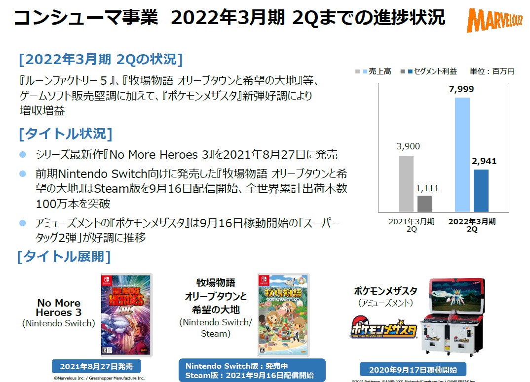 当事業のゲームソフト販売部門におきましては、本年5月に発売した「ルーンファクトリー」シリーズの最新作『ルーンファクトリー5』や、前期に発売した『牧場物語 オリーブタウンと希望の大地』が堅調に推移いたしました。『牧場物語 オリーブタウンと希望の大地』につきましては、2021年9月16日よりSteam版を発売し、全世界累計出荷本数が100万本を突破いたしました。また、「ノーモア★ヒーローズ」シリーズ最新作となる『No More Heroes 3』を、Nintendo Switch向けに2021年8月27日に発売いたしました。アミューズメント部門におきましては、新型コロナウイルスの影響を受けつつも、主力であるキッズアミューズメントマシン『ポケモンメザスタ』において、2021年9月16日より稼動を開始した「スーパータッグ2弾」が好調に推移いたしました。一方で、海外展開中の『ポケモンガオーレ』につきましては、感染拡大地域における一部営業自粛や営業制限といった影響を受けました。