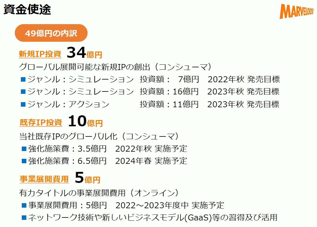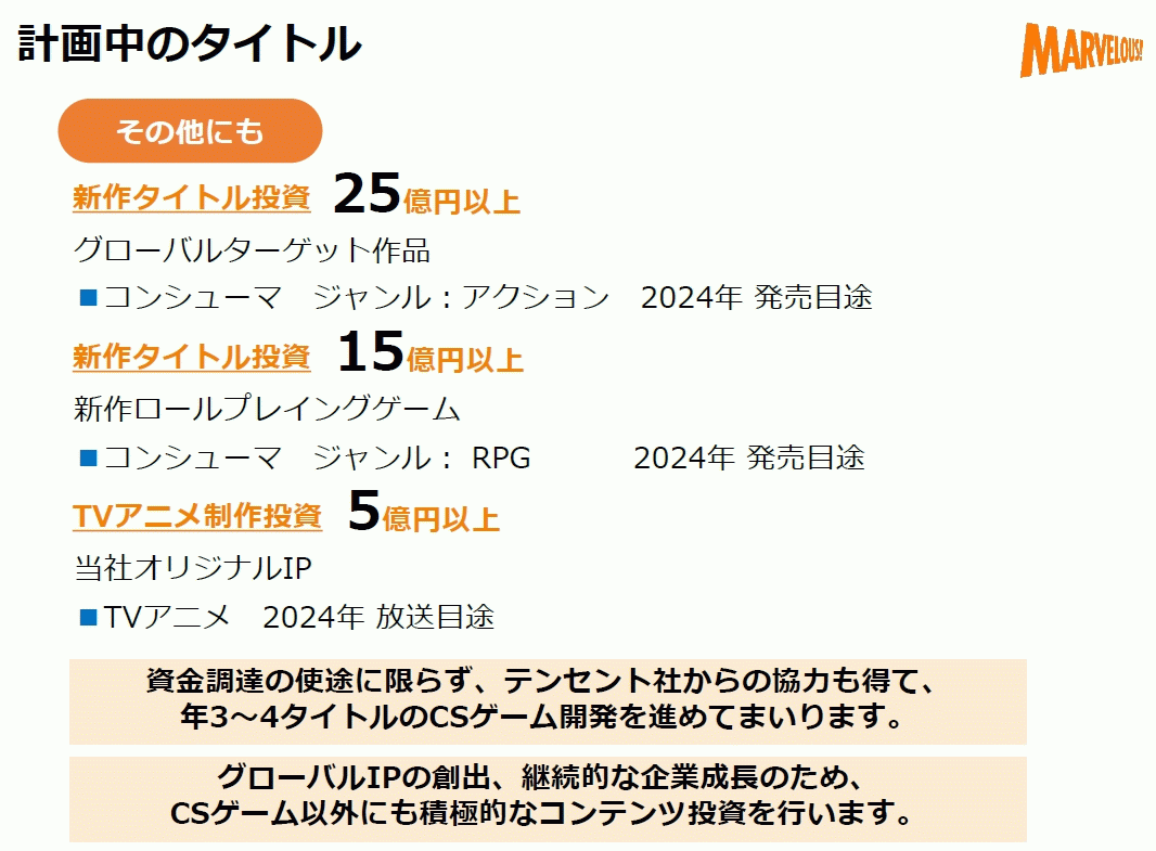 また既存IPのグローバル化に向け、コンシューマで2022年秋に3.5億円、2024年春に6.5億円を投じたタイトルを発売予定。