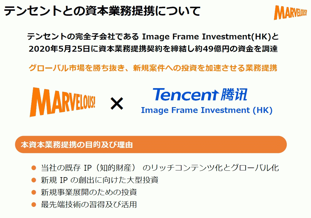 騰訊子会社との資本業務提携契約で調達する約49億円の資金に関しては、