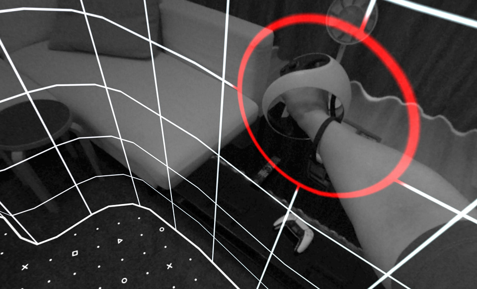 PSVR2はトラッキング用のカメラを本体に内蔵するようになったため、その撮像を内部のディスプレイに表示してヘッドセットを外さずとも外部の情報を得られる「シースルービュー」を搭載。