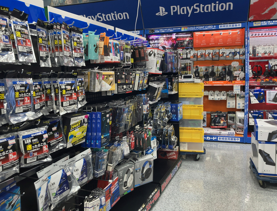 3枚目は一番奥の棚で、ハード関連のケーブルやその奥手はヘッドセットを売っているところですね。