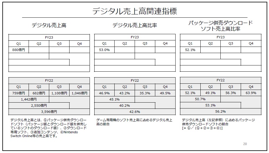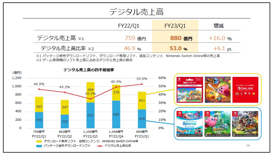 これは外から流入してくる人向けの説明なので何度も見たよって人は飛ばして良い所ですが、例えば今期第1四半期の任天堂のデジタル売上高は880億円でデジタル売上高比率は53%、なのでソフト売上高は約1660億円。