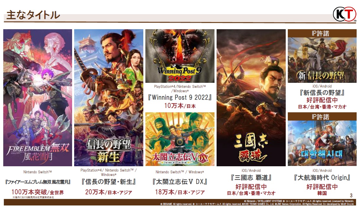 IP事業においては、国内及びアジア各地域で配信中の『三国志・戦略版』(国内では『三國志 真戦』)が、引き続き収益に貢献しました。国内及び台湾・香港・マカオ地域で配信中の『新信長の野望』も堅調です。LINE Gamesが運営を行う『大航海時代 Origin』(iOS、Android 用)が8月に韓国で配信開始されました。オフィシャルショップ「KOEI TECMO SPOT」では、7月にオンライン販売を追加しました。