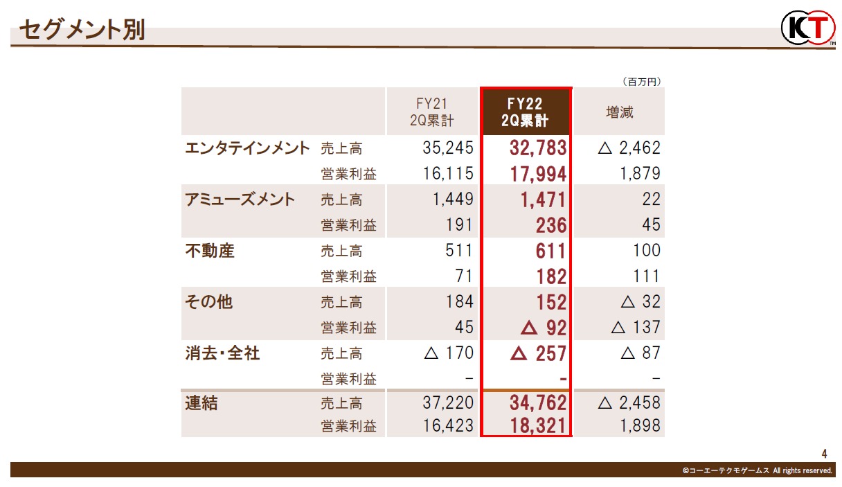 経営成績に関しては主力のゲーム…エンタテインメント事業が減収増益の主たる要因となっており、