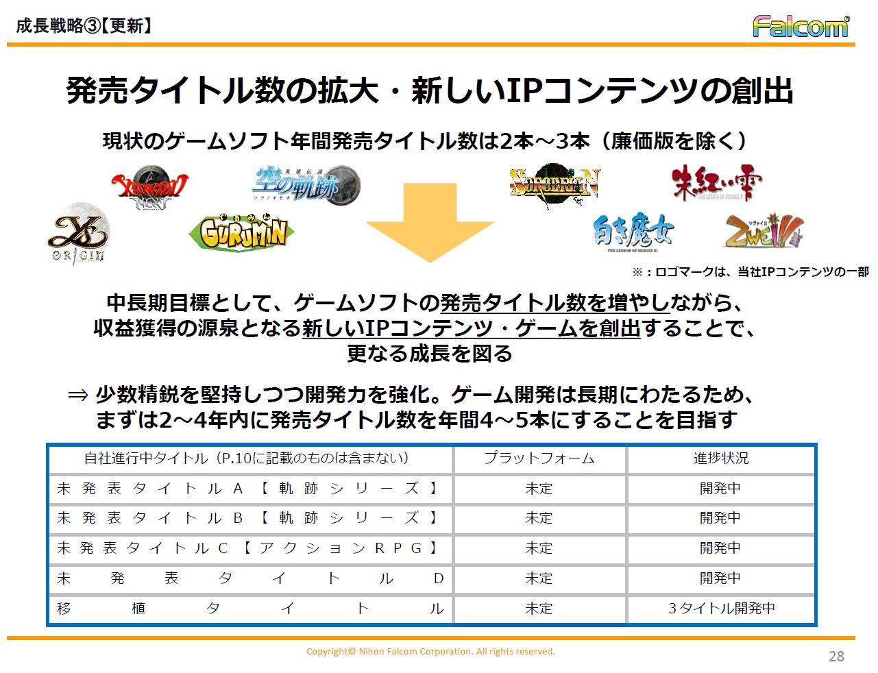 開発中のタイトルは軌跡シリーズのRPGが2本、未発表のARPGが1本、未発表タイトルが1本、移植タイトルが1本の5タイトルが存在しているとのことですが…