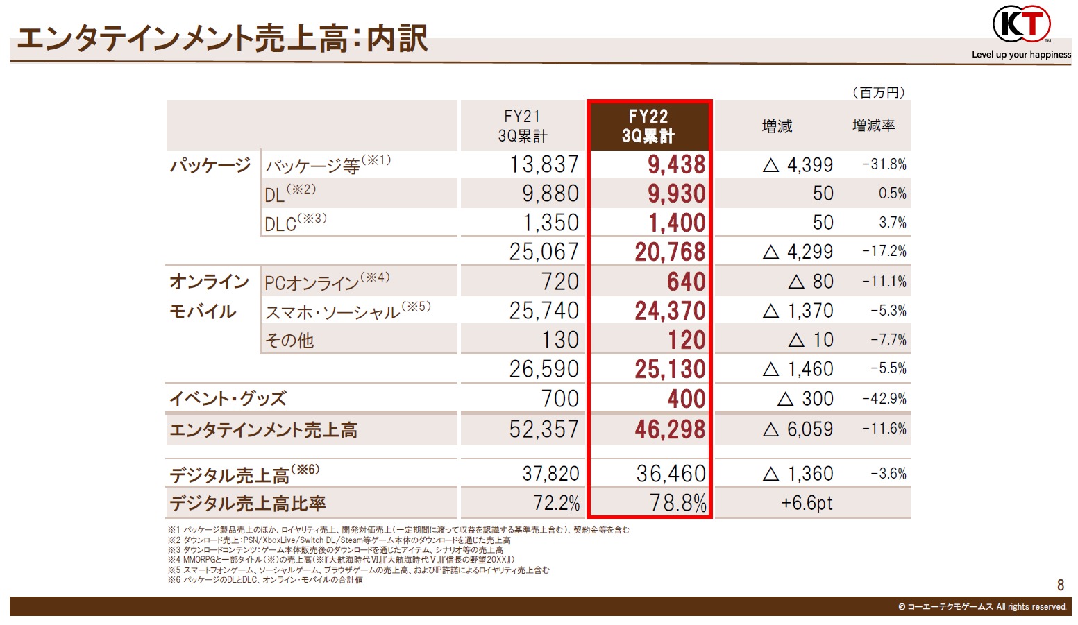 デジタル売上高比率も78.8%と低めで“パッケージ(ゲームのパッケージでは無くコンシューマゲームの事)”は更に低いのですが、これは“パッケージ等”にロイヤリティや受託分、要は任天堂他が売っているタイトルの分が含まれているからですね。