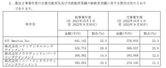 主要な顧客(売上高の一割を超える販売先)別の売上高はこのようになっていますが、この円安でも欧米向けのローカライズパブリッシャである日本一ソフトウェアアメリカと雲豹娯楽に対する売上高は前期比で大きく減少、フィジカル版の流通を担うKDEへの売上高はやや増えていますが、PSプラ向けデジタル版の国内販売を担う株SIEへの売上高は激減と。