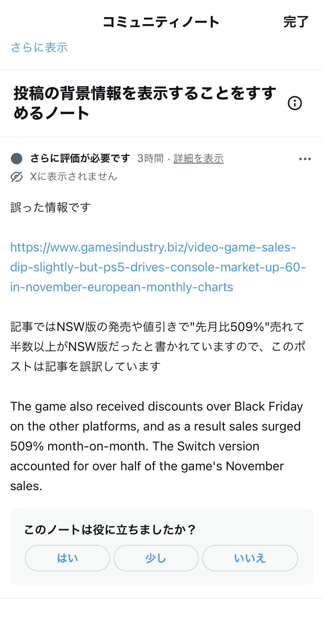 このコミュニティノートが速報スレで話題になった時点(昨日夕頃)には一旦“役に立たなかった”の集中投下で一旦非表示とされていたらしい、という話ですね。