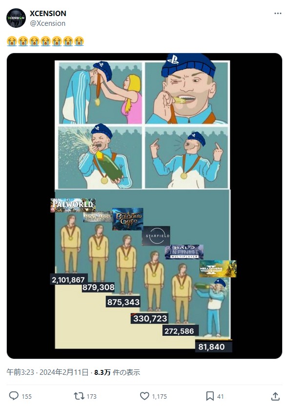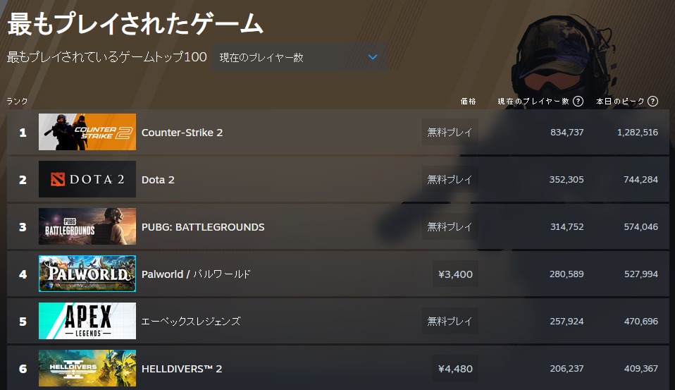 ちなみに伝説と化したStarfieldは全期間のピークが33万と少し、ここ24時間のピークプレイヤー数が11345人で現在は3802人らしいですよ。
