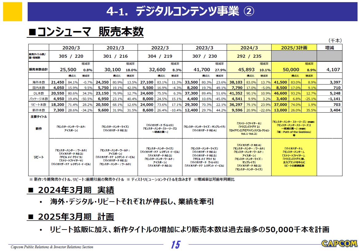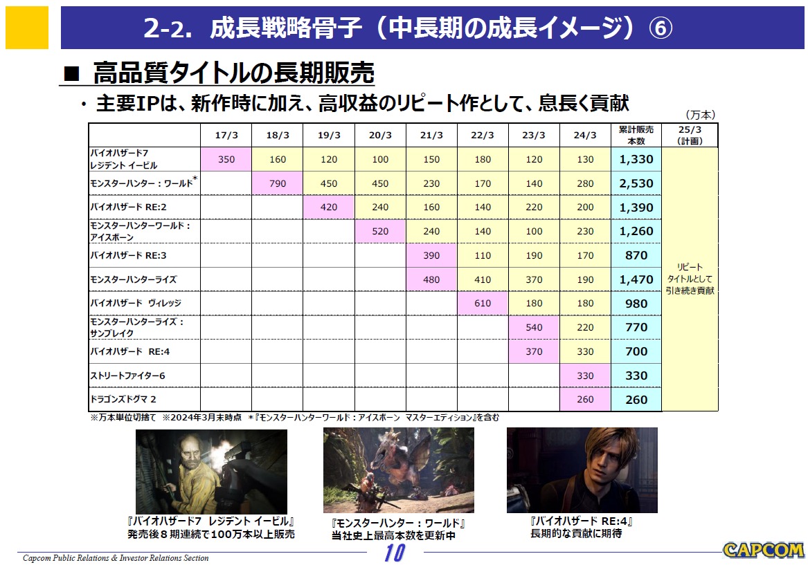 また、リピートタイトルにおいては、「モンスターハンター」シリーズの完全新作『モンスターハンターワイルズ』の制作発表に併せ、同シリーズのリピートタイトル『モンスターハンター:ワールド』の販売が好調な結果となり、全世界で2,532万本を達成するとともに、『モンスターハンターワールド:アイスボーン』、『モンスターハンターライズ:サンブレイク』も続伸しました。さらに、昨年3月発売の『バイオハザードRE:4』が累計702万本を販売したことに加え、積極的なプロモーションによるIPの認知拡大と新たなファン層の獲得を図る施策等を行い、『バイオハザードRE:2』などのシリーズタイトルを中心に販売しました。その結果、リピートタイトルの販売本数が3,629万本と前期の2,930万本を上回り、収益を押し上げました。