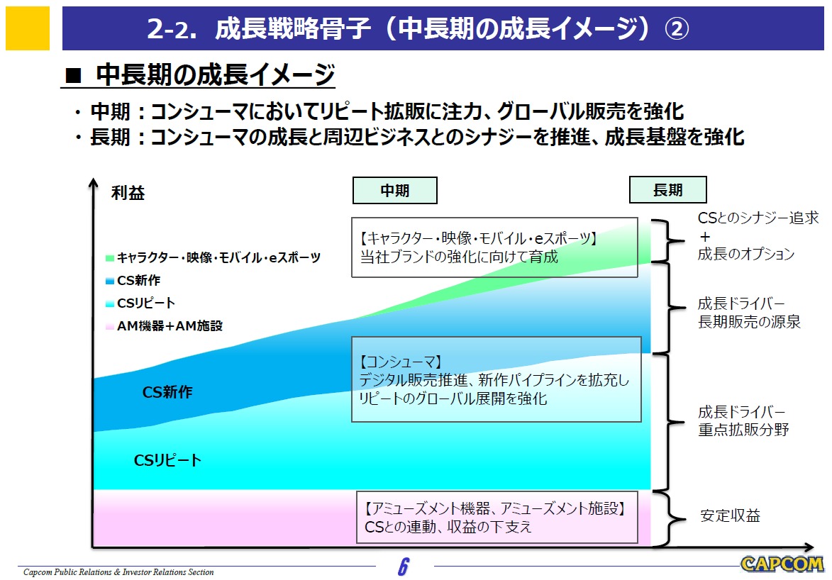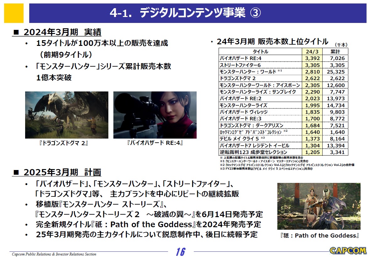 当事業におきましては、完全新作タイトルの『祇(くにつがみ):Path of the Goddess』(Xbox Series X|S、プレイステーション5、パソコン用)を投入するほか、過去作品『モンスターハンターストーリーズ』および『モンスターハンターストーリーズ2 ~破滅の翼~』の現行機向けへの移植や、当期発売の『ストリートファイター6』のeスポーツ展開の強化により、引き続きブランドの価値向上とユーザー数の拡大を推し進めてまいります。加えて、『ドラゴンズドグマ2』等のリピートタイトルについても、デジタル販売の強化と販売施策の推進により、収益の最大化と総販売本数の継続的な増加に努めてまいります。