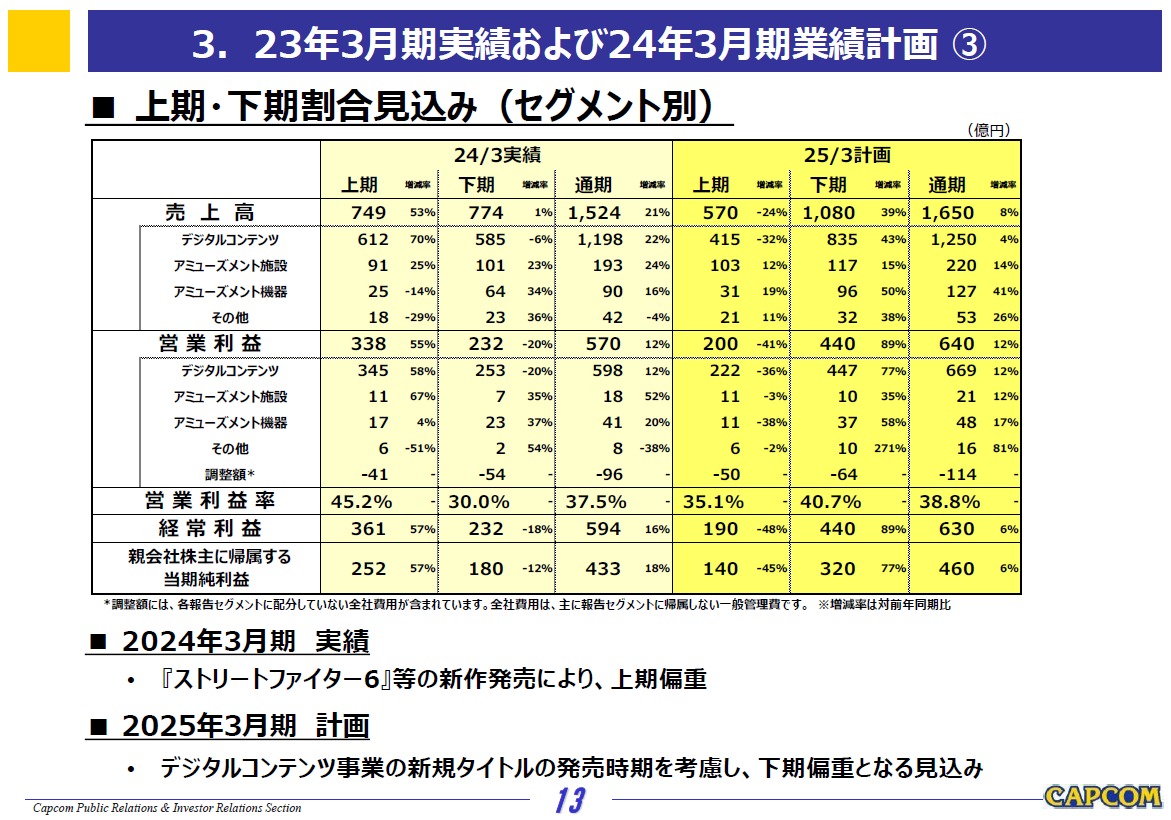 カプコンの今期業績予想は下期偏重と。