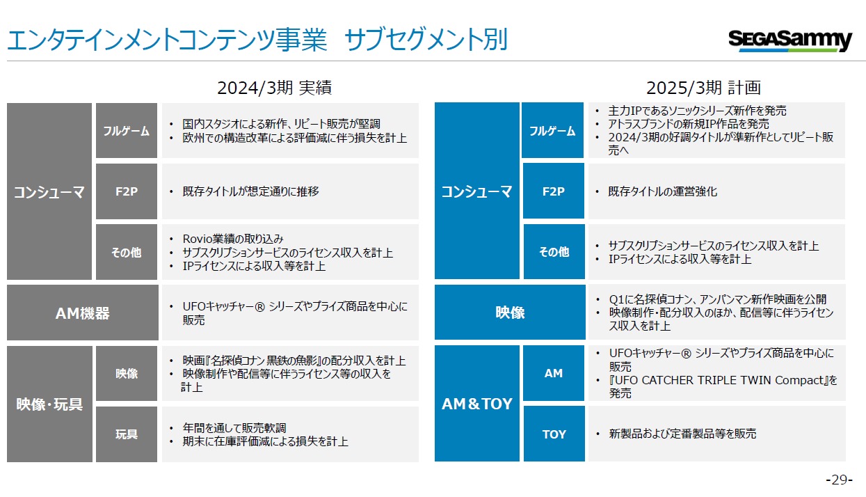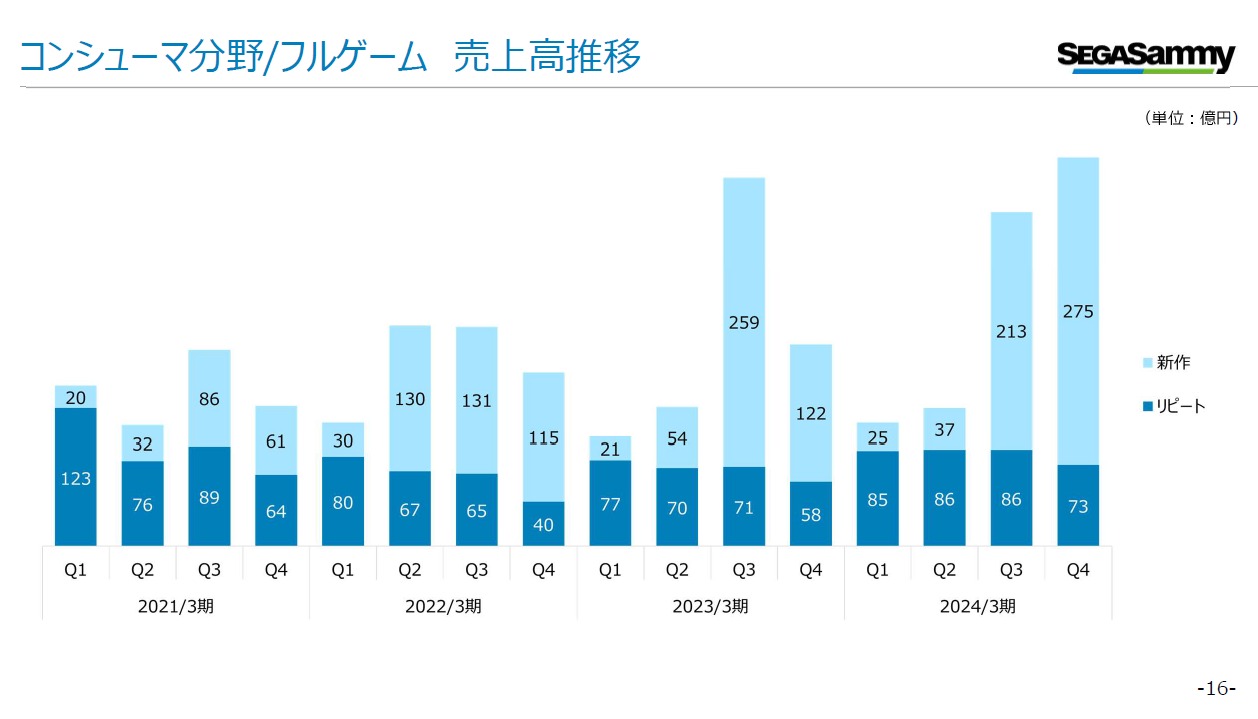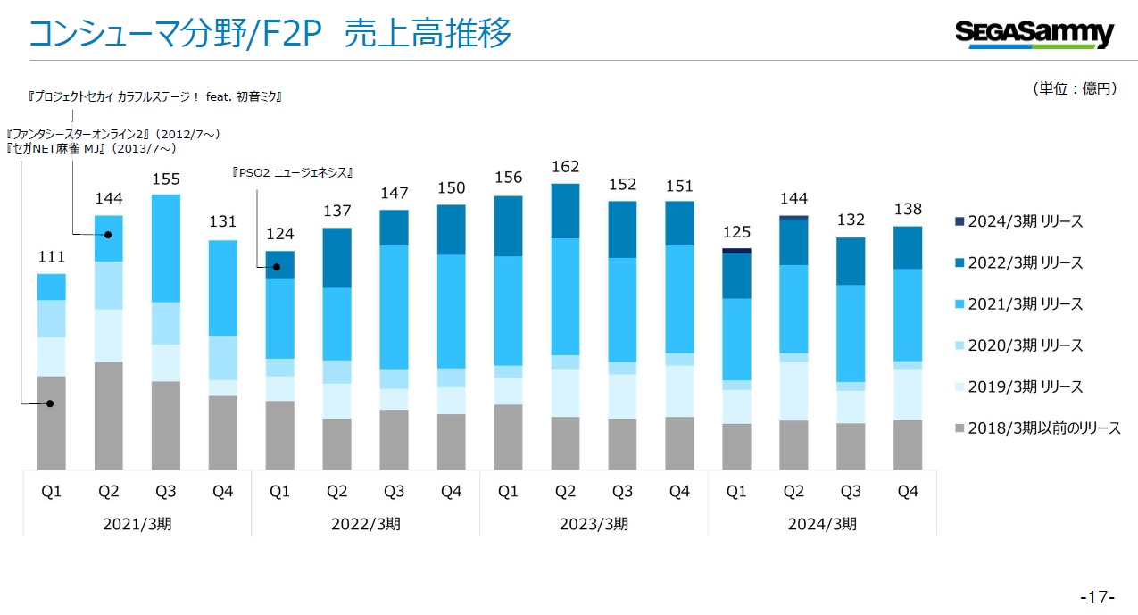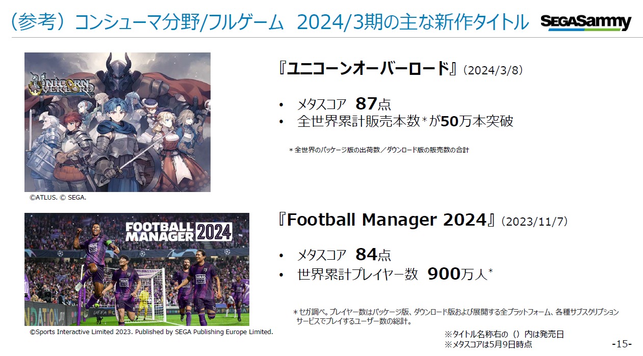 コンシューマ分野のフルゲームにおきましては、新作タイトルとして『ソニックスーパースターズ』、『龍が如く8』、『ペルソナ3 リロード』、『Football Manager 2024』等を販売し、販売本数は923万本(前期は1,009万本)となりました。また、リピートタイトルの販売本数は1,866万本(前期は1,779万本)となりました。これらの結果として、フルゲームの販売本数は全体で2,789万本(前期は2,789万本)となりました。F2Pにおいては、引き続き『プロジェクトセカイカラフルステージ! feat. 初音ミク』及び、開発は株式会社セガ、パブリッシャーは株式会社バンダイナムコエンターテインメントが担う『ONE PIECE バウンティラッシュ』が牽引しました。