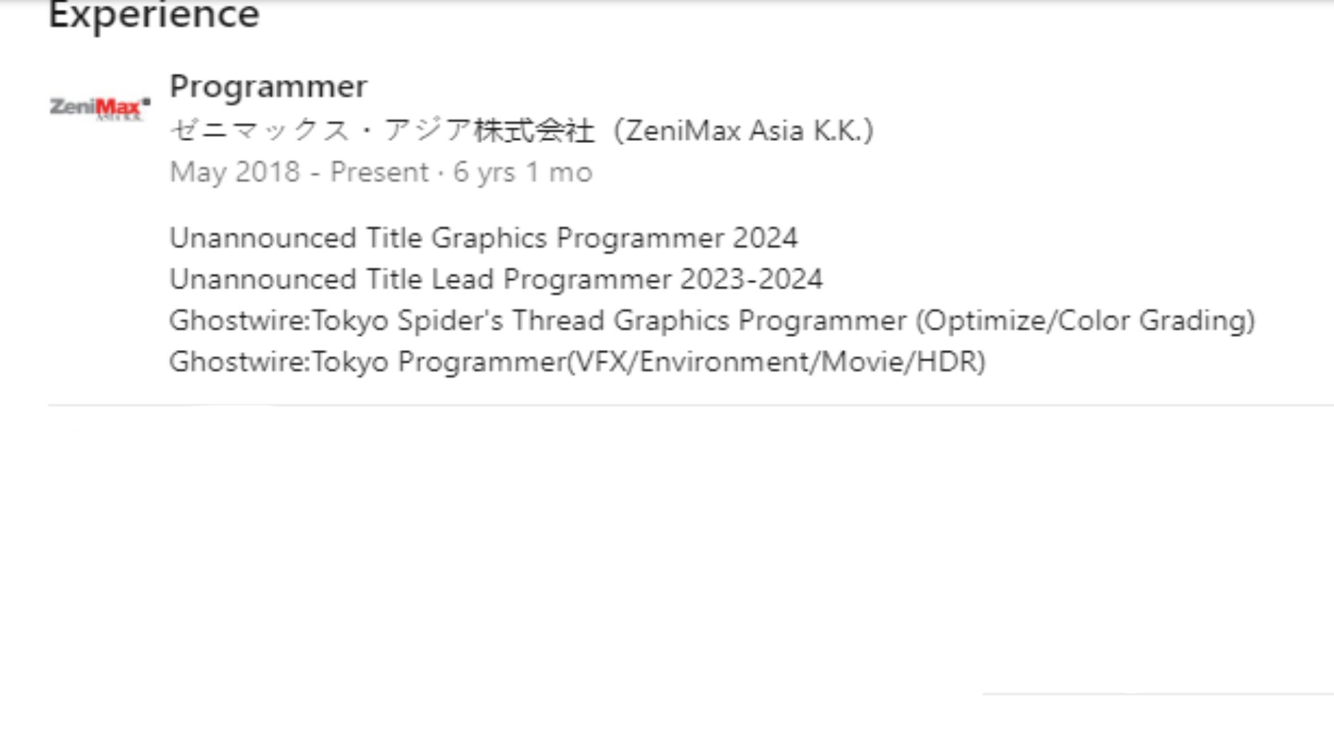 そして、Tango GameworksでGhostwire: Tokyoの開発を手がけたTsuyoshi Okugawa氏はプロフィールに未発表のタイトルを手がけていた事を明らかに。