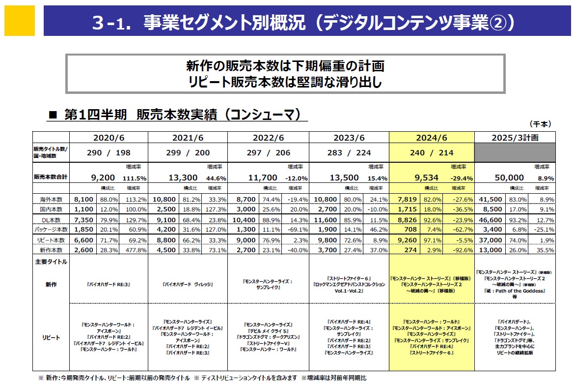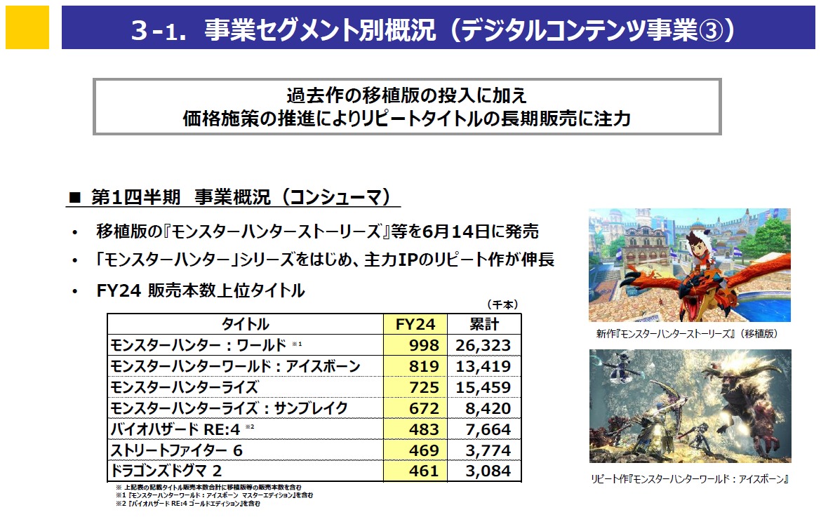 また、リピートタイトルにおいては、前期発売の主力シリーズの大型新作タイトル『ストリートファイター6』について、引き続きeスポーツ展開との連携強化によるブランド認知とユーザー数の拡大を推し進めるとともに、3月発売の『ドラゴンズドグマ2』も計画どおり推移しました。そのほか、積極的なプロモーションによるIPの認知拡大と新たなファン層の獲得を図り、『バイオハザードRE:4』などシリーズタイトルを中心に販売しました。