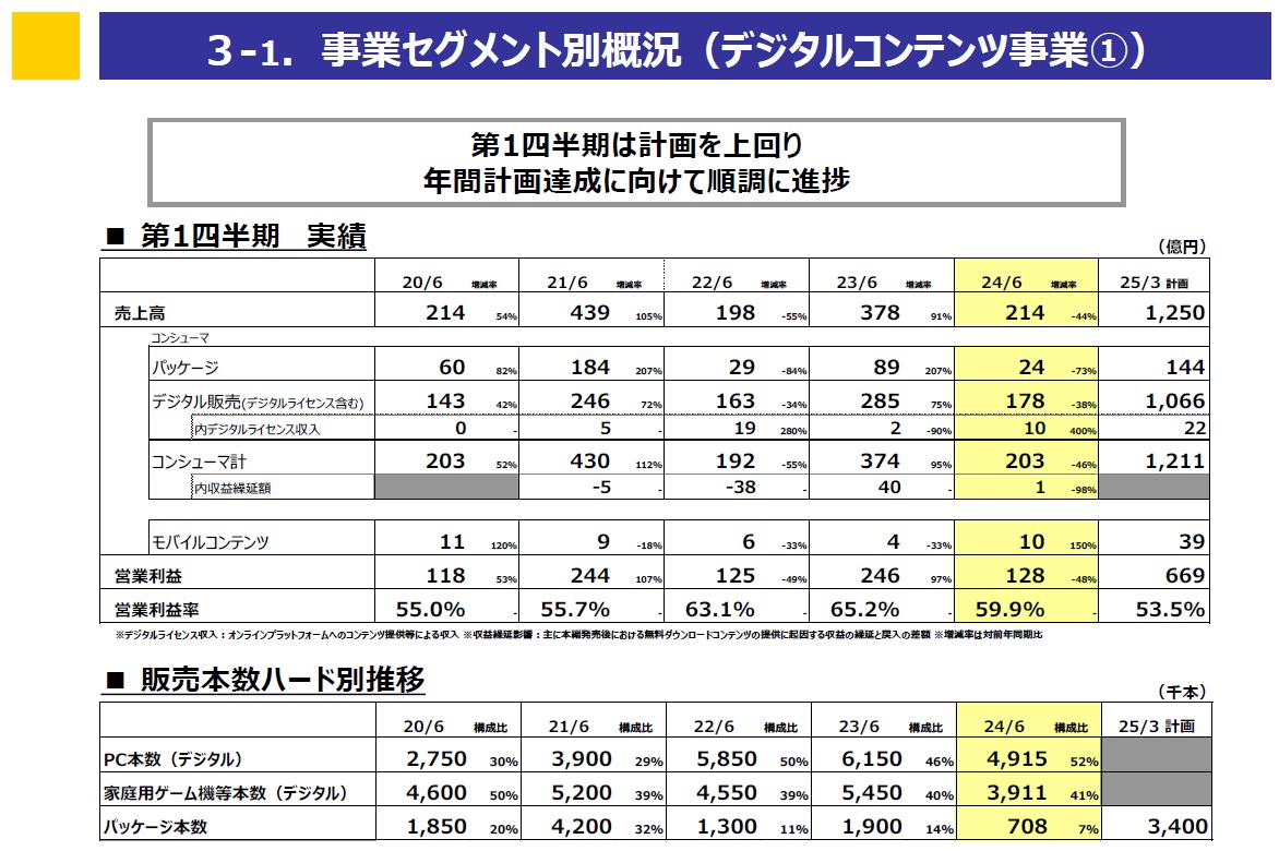 以上により、当第1四半期の販売本数は、『ストリートファイター6』を発売した前年同期と比較し減少しましたが、年間計画達成に向け、おおむね計画どおりの進捗となりました。