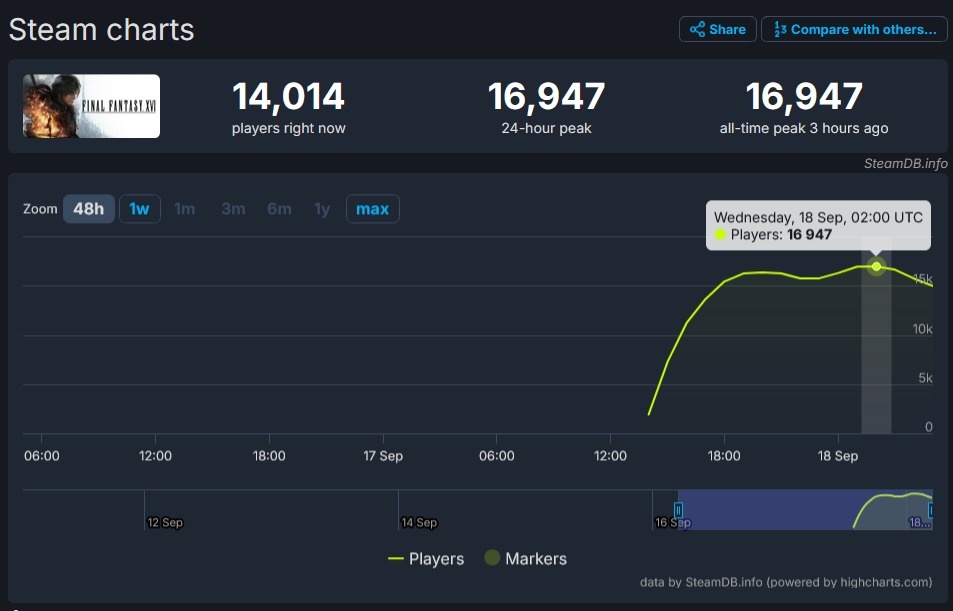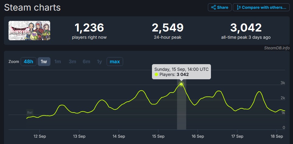 [Steamdb: FINAL FANTASY XVI - Steam charts / DRAGON QUEST MONSTERS: The Dark Prince]