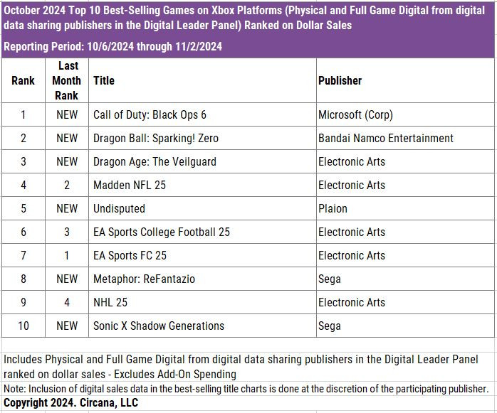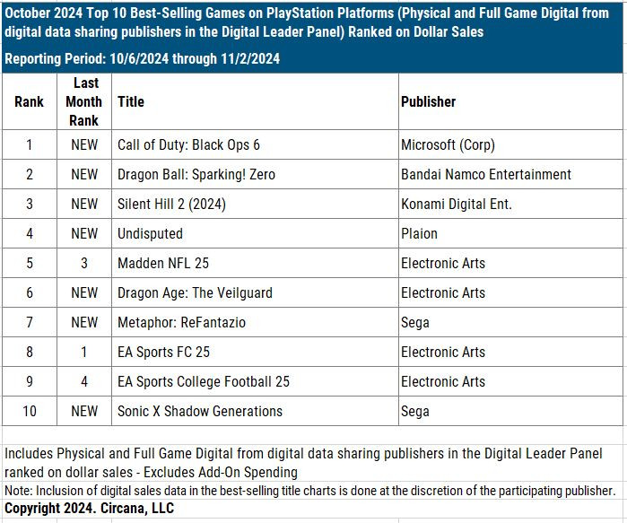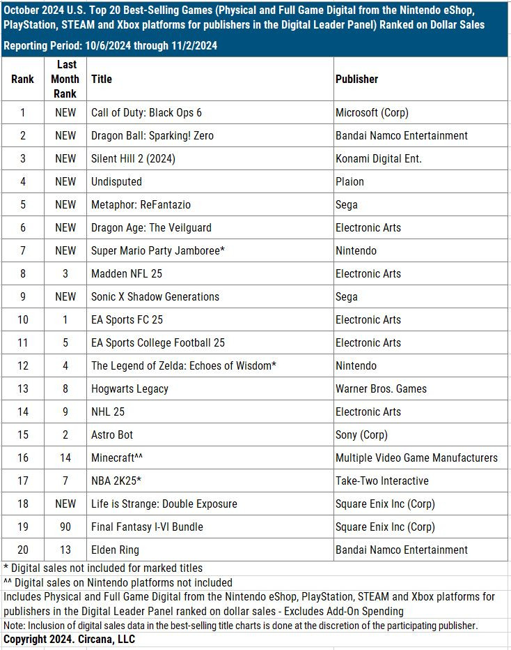 首位の「Call of Duty: Black Ops 6」は昨年のCoDMW3と比べ23%増となったとのこと。