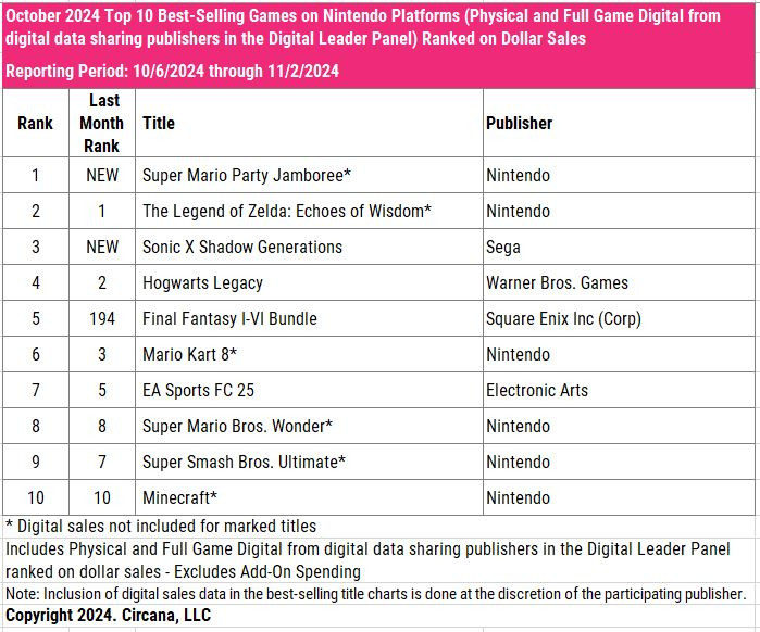 2024年10月の米Circana(旧NPD)集計は、全体が前年同月比10%増の46.62億ドル、ゲームコンテンツが12%増の42.27億ドル、ゲーム機が23%減の2.49億ドル、周辺機器が15%減の1.87億ドルとコンテンツは好調ながらハードは減少という結果に。