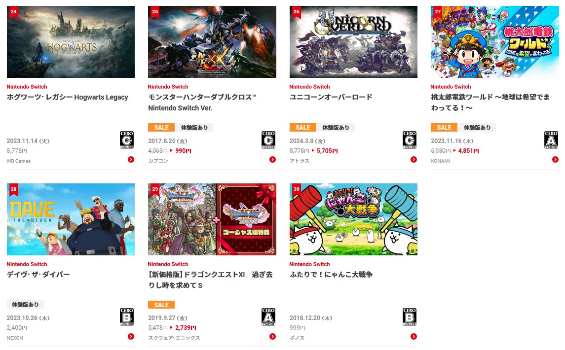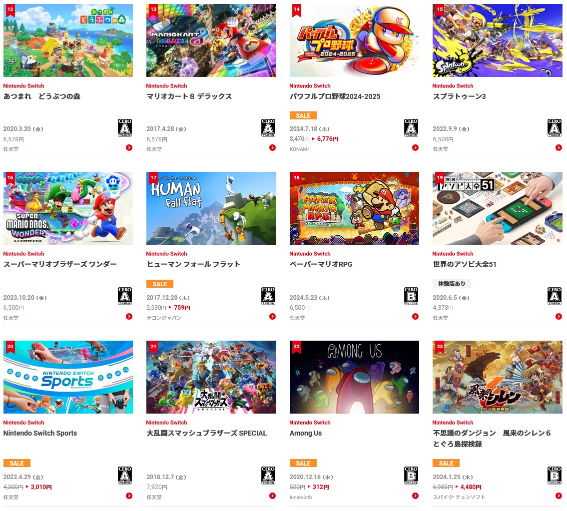 CEROでレーティングされたタイトル(基本的にフィジカル版が存在するタイトル)のみなのは、そうしないとIARCレーティングで投げ売りされているタイトルに埋め尽くされるからなのでしょうが、CERO:Cまでというのは…