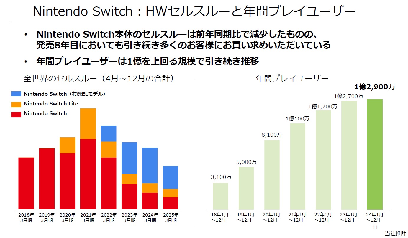 当第3四半期(2024年4月~12月)のNintendo Switchビジネスは、9月に発売した『ゼルダの伝説知恵のかりもの』が391万本、10月に発売した『スーパーマリオパーティジャンボリー』が617万本と、新作タイトルが順調に販売を伸ばしました。また、『マリオカート8 デラックス』が538万本(累計販売本数6,735万本)の販売を記録するなど、前期以前に発売したタイトルも安定した販売状況が続いています。