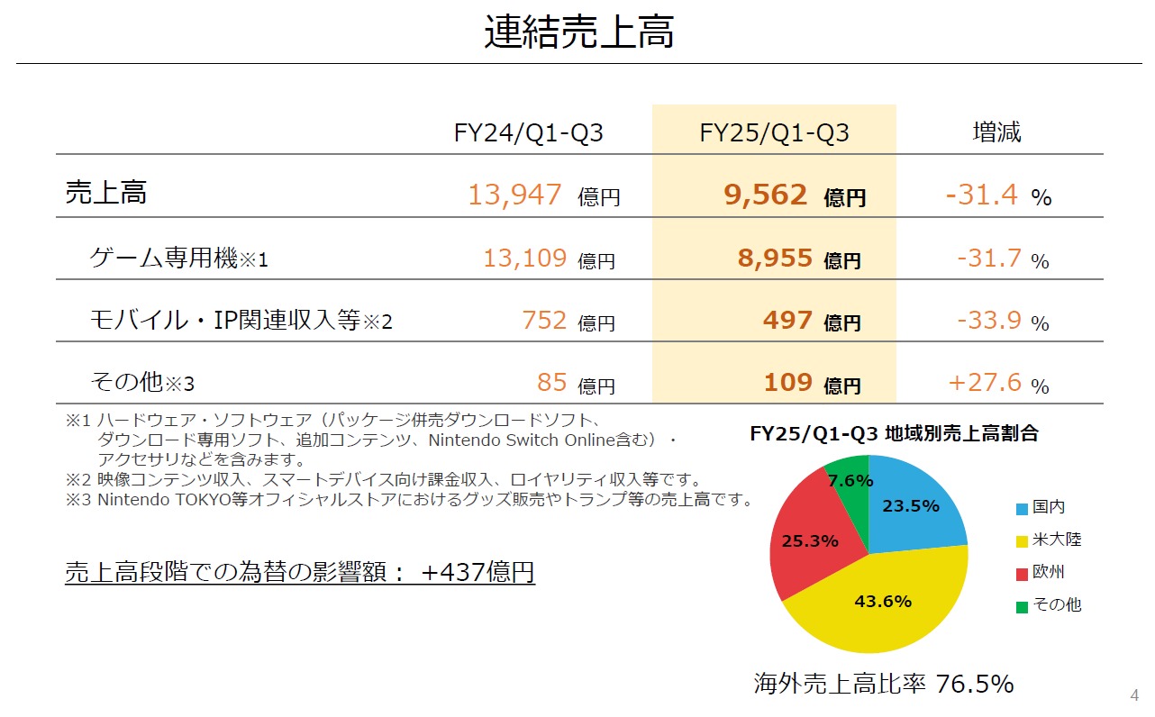 任天堂の第3四半期決算は売上高が前年同期比31.4%減の9572.18億円、営業利益が46.7%減の2475.97億円、経常利益が42.3%減の3271.17億円、純利益が41.9%減の2371.89億円と大幅減収減益。