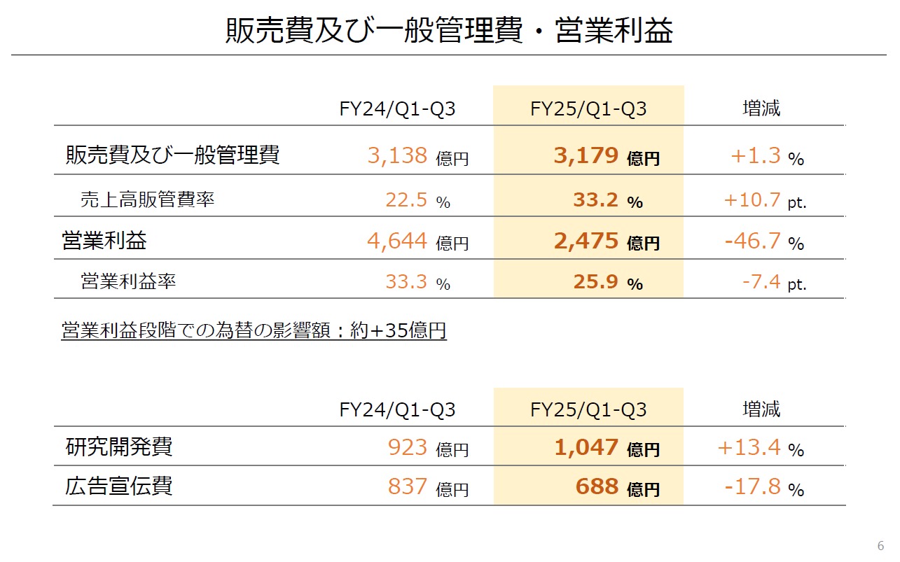 これらの状況により、売上高は9,562億円(うち、海外売上高7,315億円、海外売上高比率76.5%)、営業利益は2,475億円となりました。また、受取利息が440億円発生したことなどにより、経常利益は3,271億円、親会社株主に帰属する四半期純利益は2,371億円となりました。