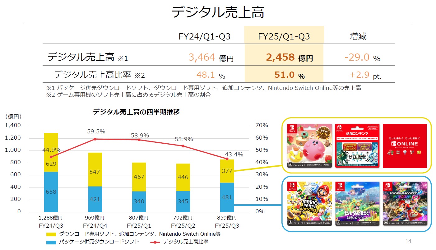 ゲーム専用機におけるデジタルビジネスにおいては、主にNintendo Switchのパッケージ併売ダウンロードソフトの売上が減少したことにより、デジタル売上高は2,458億円(前年同期比29.0%減)となりました。